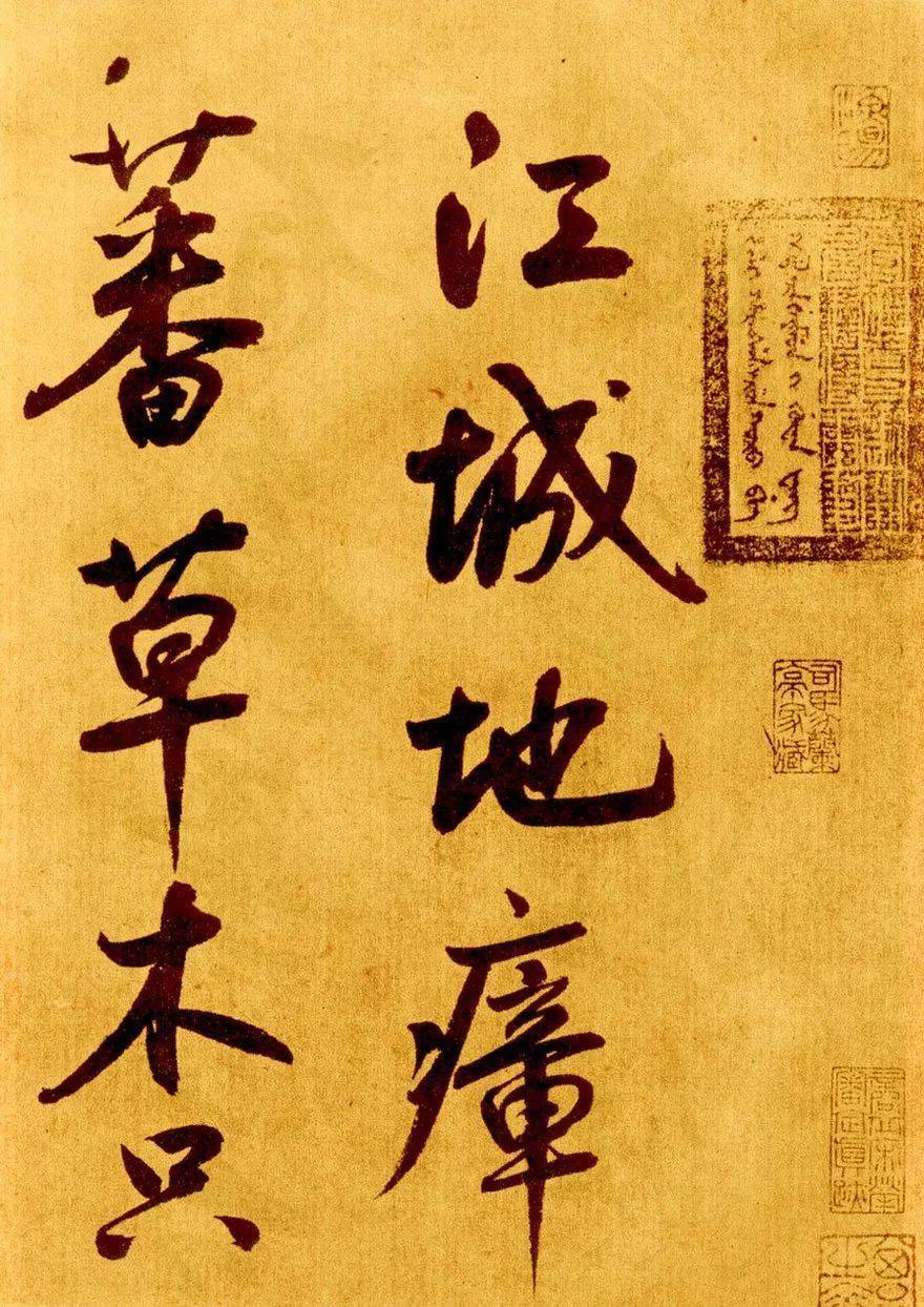 这卷书法录的是苏轼贬谪黄州时写的《海棠诗》,诗里海棠“嫣然一笑竹篱间”,鲜于枢的笔墨也跟着“笑”开了——起笔藏锋蓄势,转折处方圆兼备,线条圆润如绵裹铁,既有颜真卿《祭侄稿》的悲壮,又带怀素草书的洒脱。最妙的是他写“朱唇得酒晕生脸”时,“晕”字粗细对比强烈,像极了喝醉后泛红的脸颊,活灵活现。